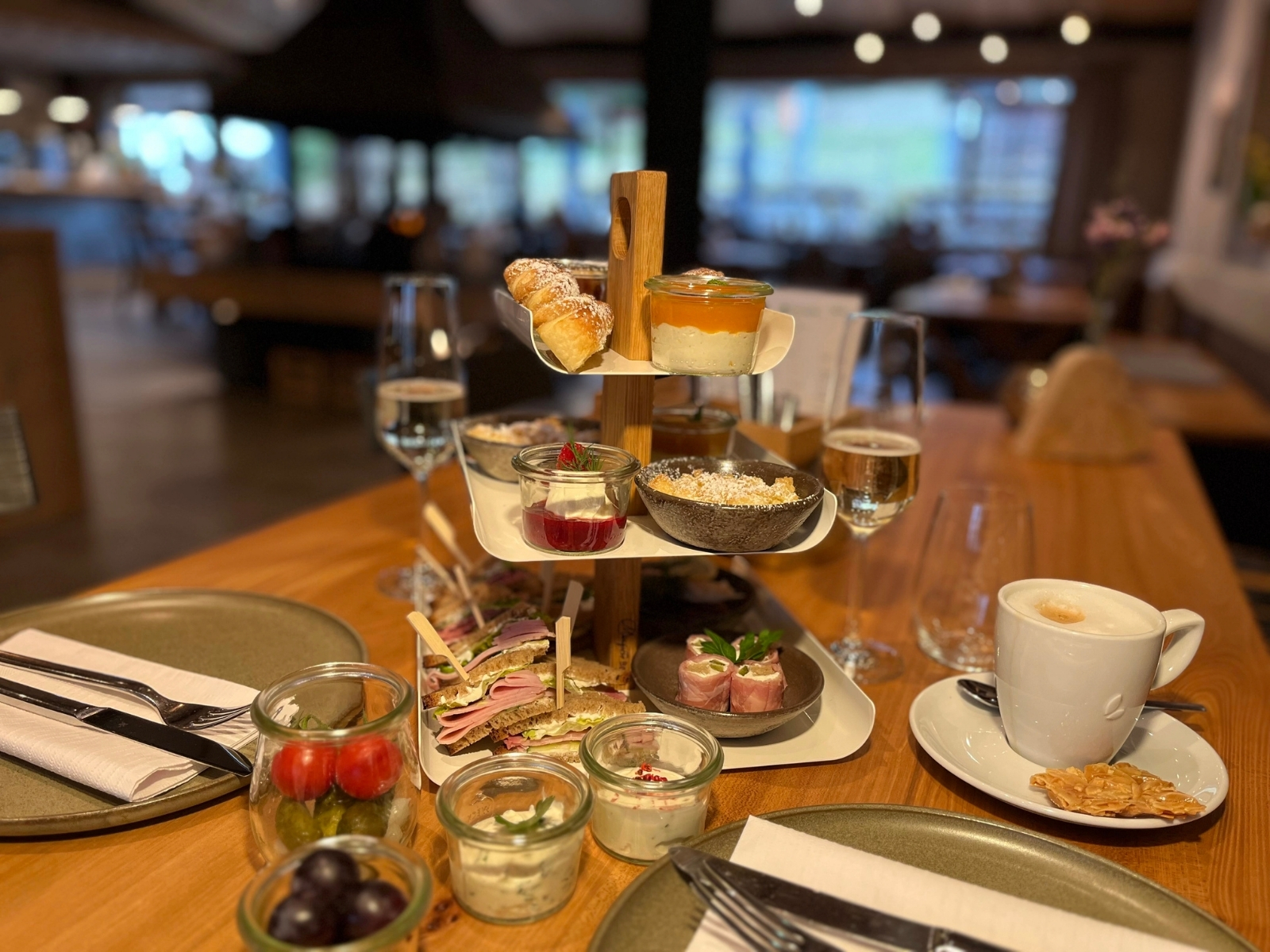 Erleben Sie anschließend einen exklusiven Nachmittagsgenuss, der sich wie eine kleine Auszeit vom Alltag anfühlt. Es erwartet Sie eine liebevoll zusammengestellte Etagere mit regionalen süßen und herzhaften Köstlichkeiten – in einer ruhigen, entspannten Atmosphäre. Hier können Sie abschalten, neue Energie tanken und unsere besondere LiebesGrün-Kulinarik entdecken.