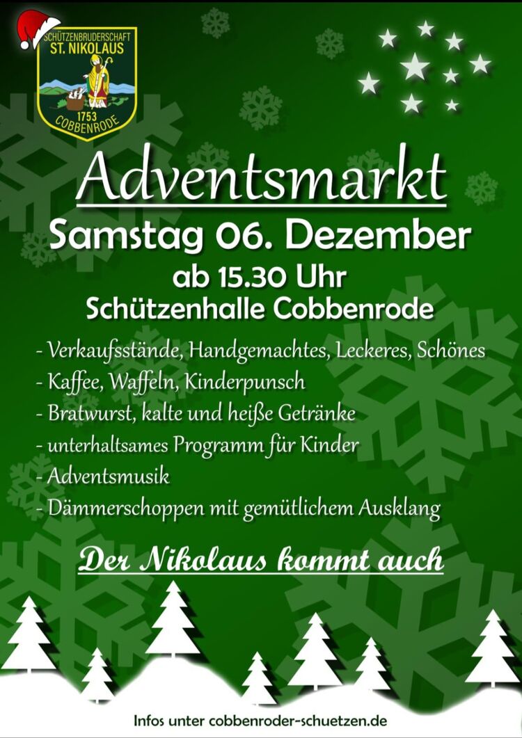 Am Samstag, den 06.12.2025 findet ab 15.30 Uhr der Adventsmarkt in und an der Schützenhalle Cobbenrode statt.