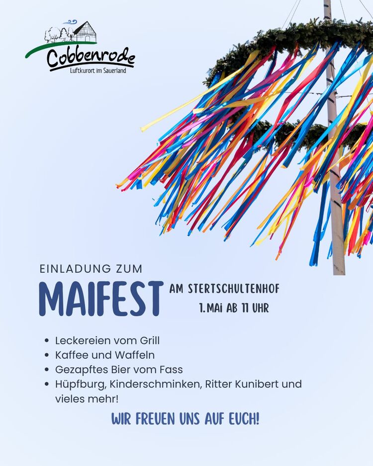 Am 01.05.26 startet um 11.00 Uhr das Maibaumfest unter dem schönsten Maibaum im Sauerland am Stertschultenhof Cobbenrode.