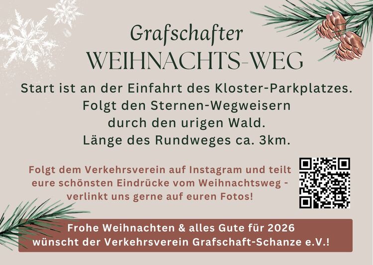 Auch in diesem Jahr öffnet der Grafschafter Weihnachtsweg wieder für alle Besucherinnen und Besucher, die sich in der Advents- und Weihnachtszeit eine besondere Auszeit gönnen möchten. Der rund 3 Kilometer lange Rundweg startet an der Einfahrt zum Kloster-Parkplatz, Sternen-Wegweiser begleiten die Besucher durch den urigen Wald.